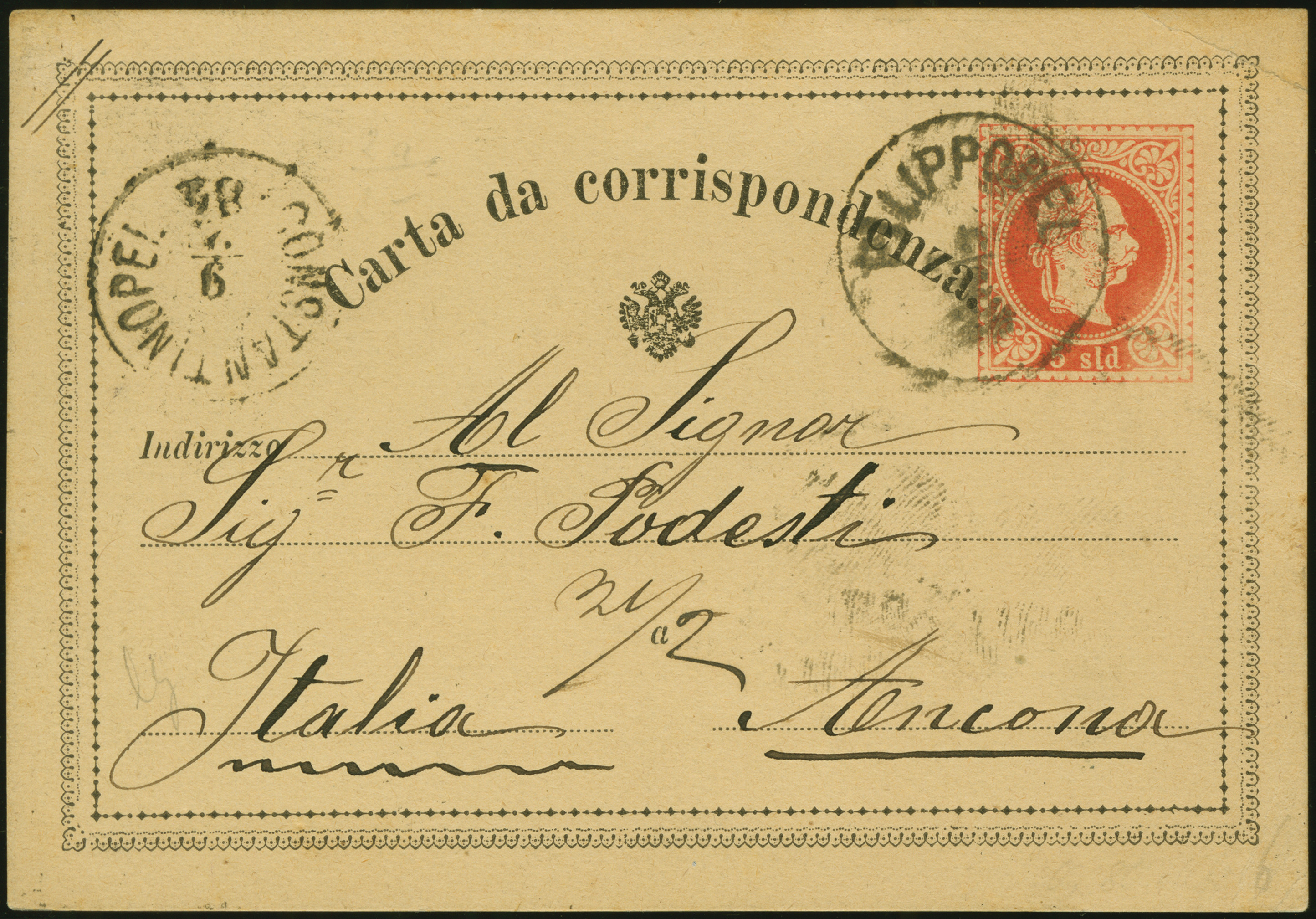 1884 (February 6), 5 sld. Franz Josef stationery card to Ancona, Italy, struck with Filippopel c.d.s., Constantinople c.d.s. transit (9 Feb) opposite, some light edge wear, but an uncommon destination.
