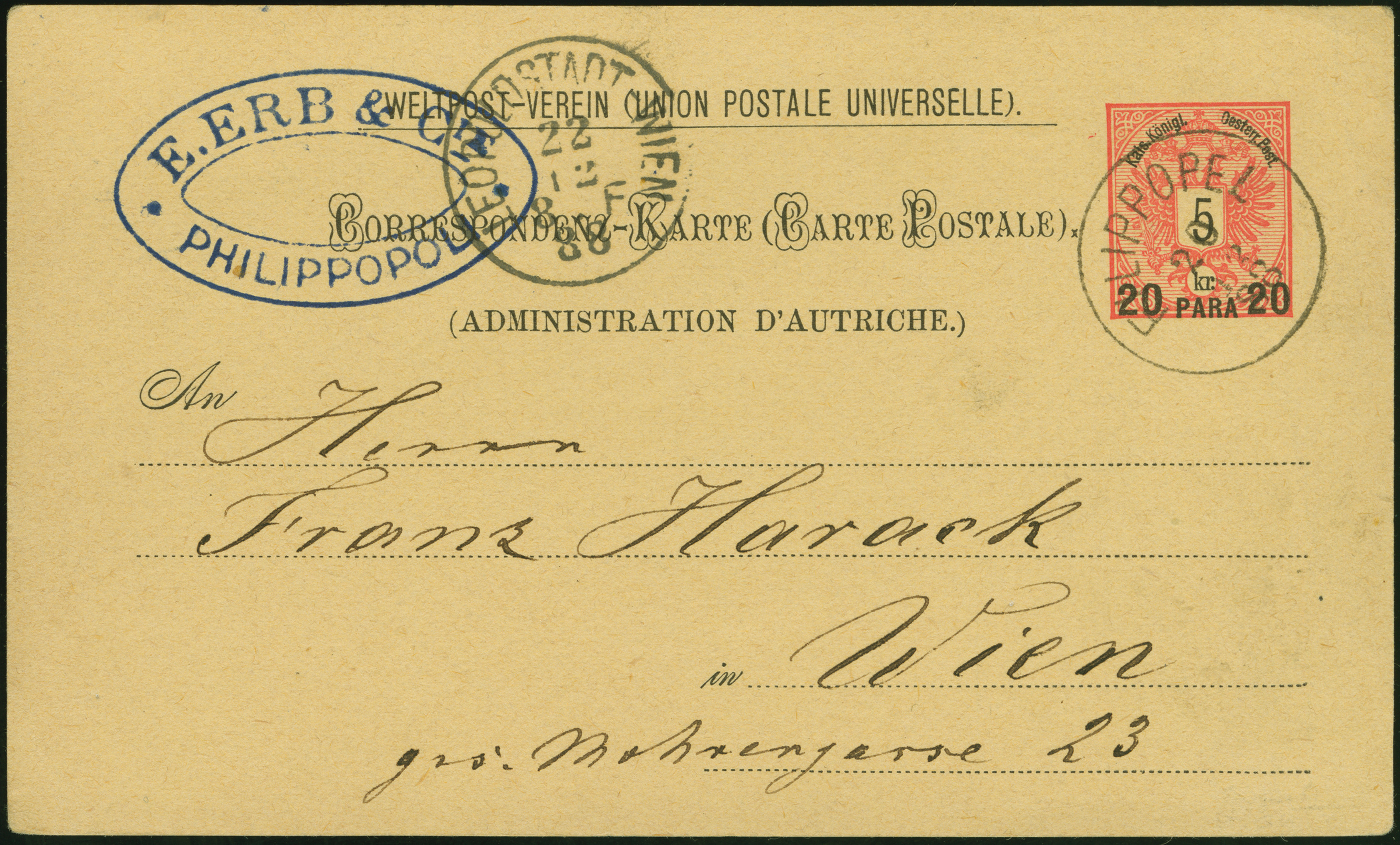 1888 (January 29), 20pa on 5kr postal stationery card, cancelled by choice Filippopel c.d.s., bold oval commercial sender's handstamp at left, to Vienna, with equally crisp c.d.s. receiver (22 Dec) on front, very fine.