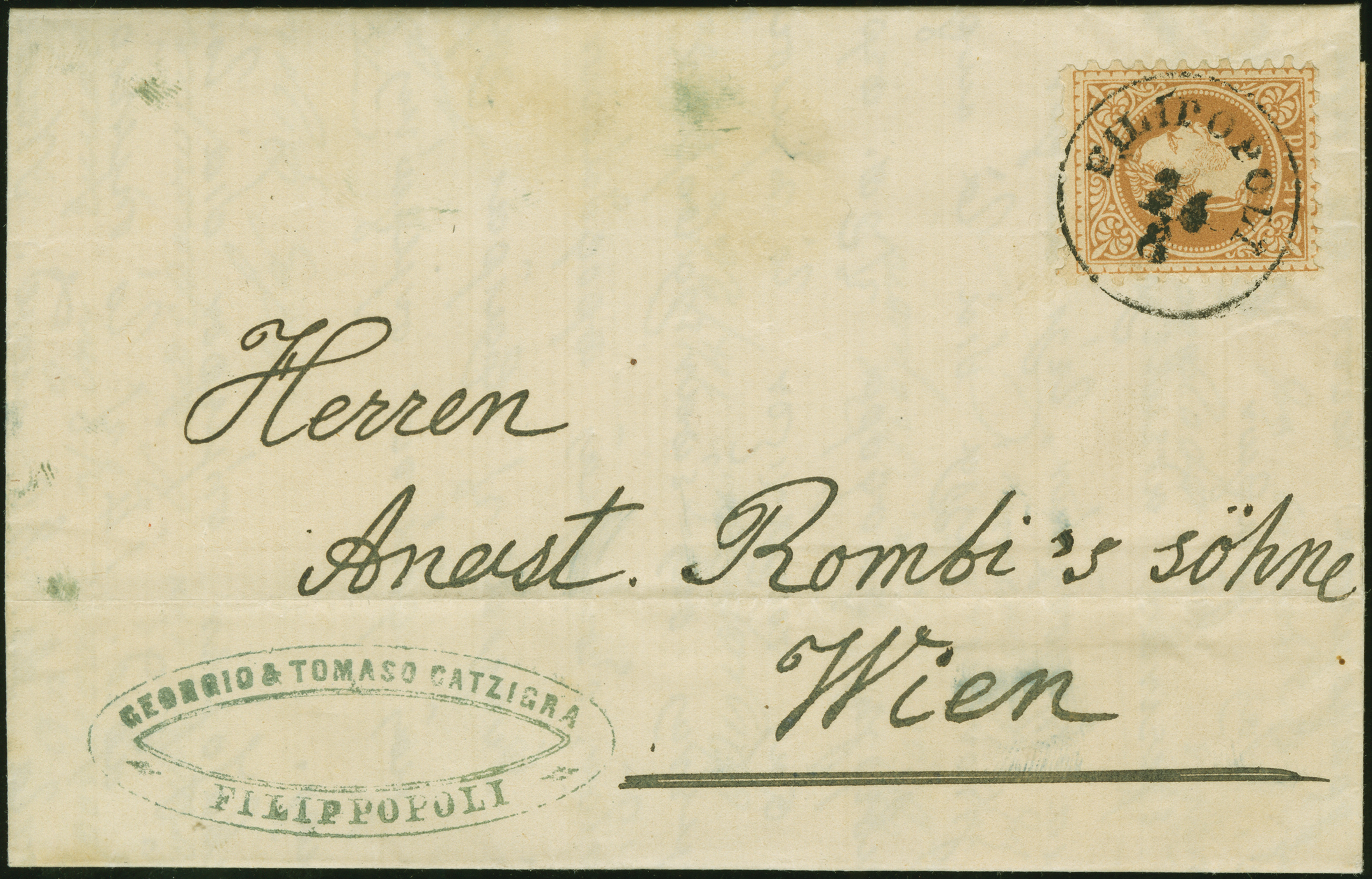 1870 (August 24), folded letter to Vienna, franked with Austrian Levant 15 sld. brown, Coarse Print, tied by Filipopoli c.d.s., with c.d.s. arrival backstamp (2 Sep), quite fresh, a desirable single franking.