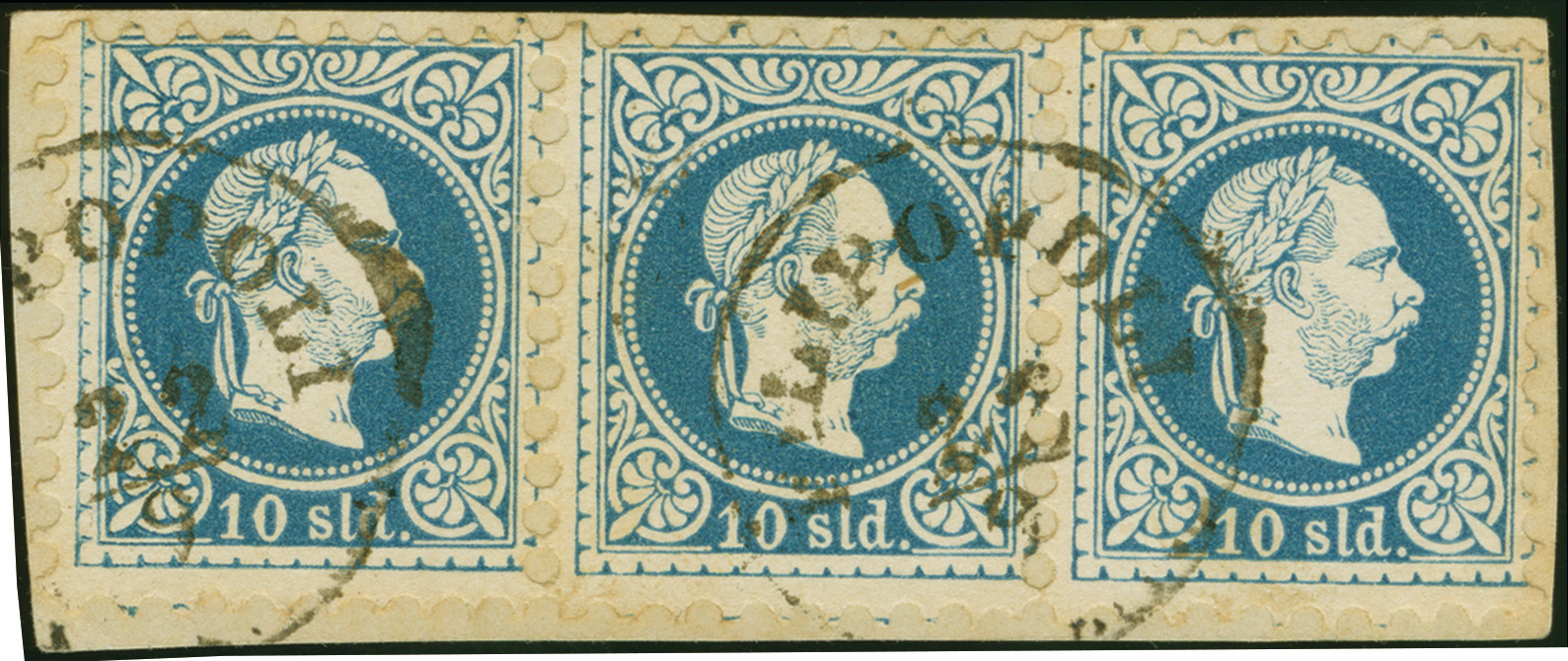 1876-83, 10 sld. blue Franz Josef, Fine Print, horizontal strip of three, tied to small piece by two strikes of Filipopoli c.d.s. fresh colour, a scarce multiple.