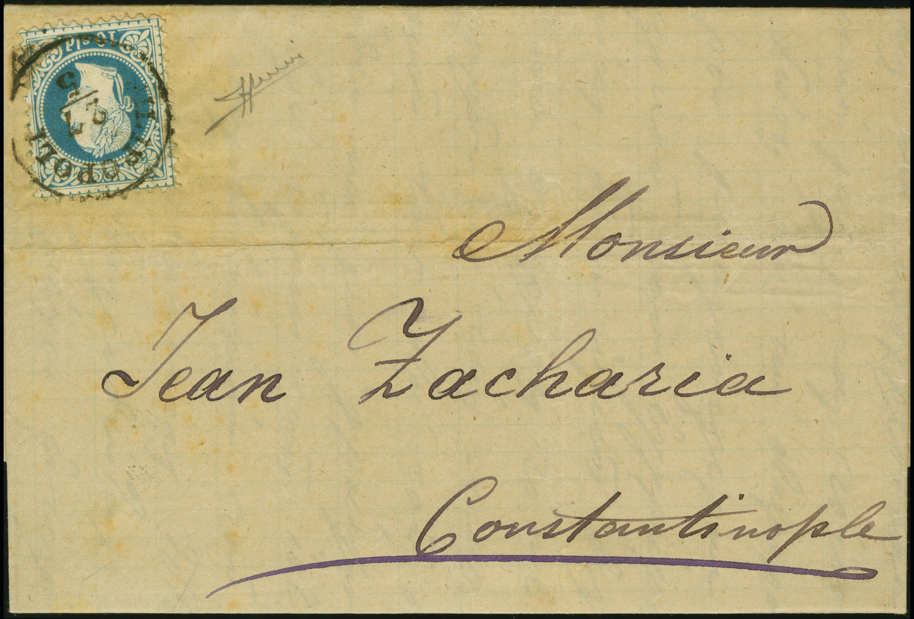 1879 (May 27), folded letter to Constantinople, franked with 10 sld. blue, Fine Print, tied by neatly-struck Filipopoli c.d.s., reverse with c.d.s. arrival backstamp (30 May), slight toning surrounding adhesive, else fine, signed Sorani.