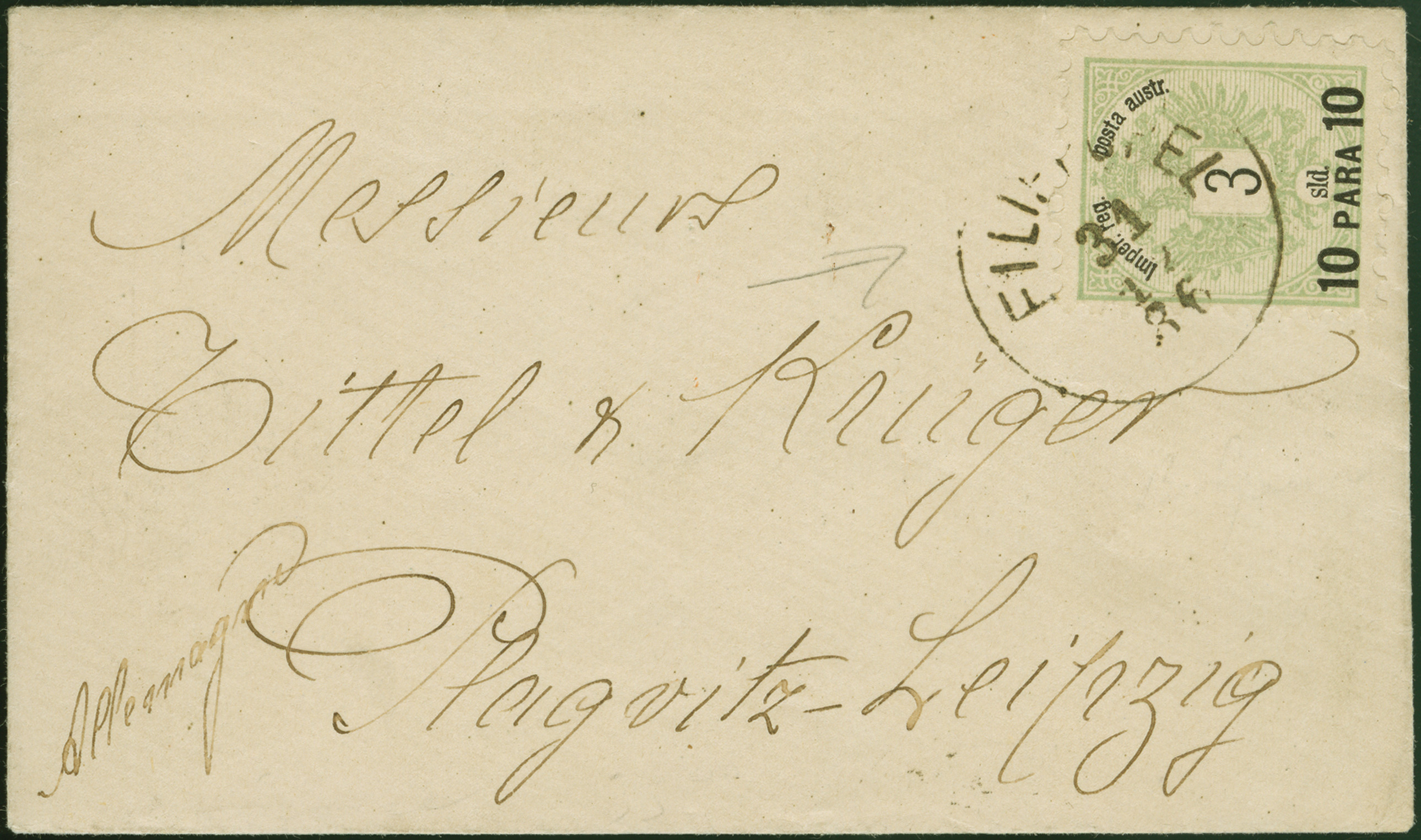 1886 (31 December), 10pa on 3sld. Coat of Arms, tied to cover to Leipzig by Filipopoli c.d.s., reverse with Constantinople transit (3 Jan), Leipzig c.d.s. receiver (7 Jan), a fresh and very fine single franking, paying the printed matter rate.