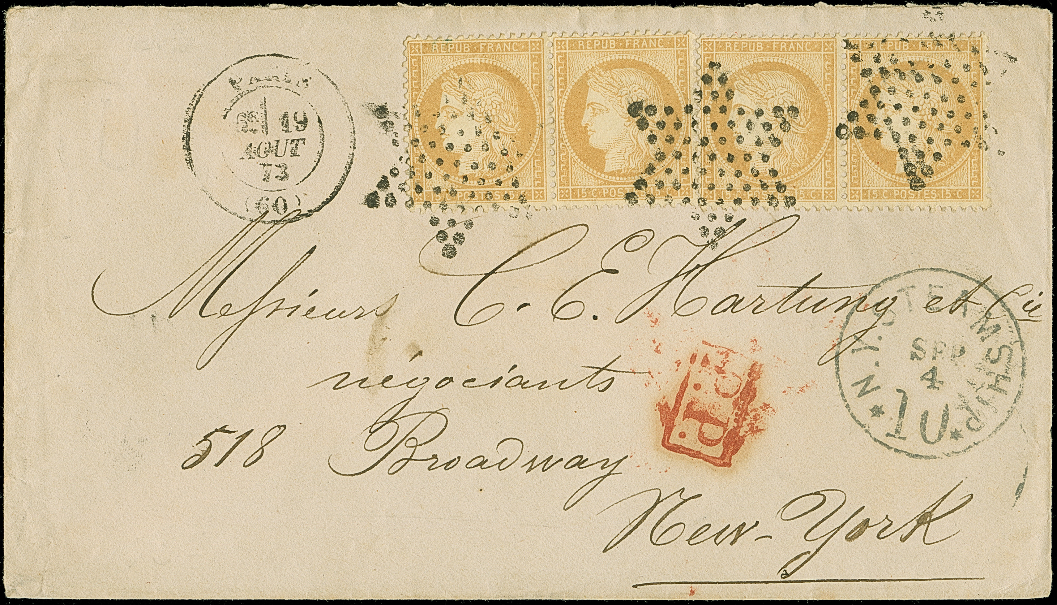 1873, Ceres 15 c. yellowish-brown two pairs, performing 60 c. rate, tied to envelope by Paris Star cancellation, red PD and PARIS 19/AOUT/73 cds. in black alongside, addressed to New York with arrival mark N.Y. STEAMSHIP 10 SEP/4 on front, very fine and attractive.