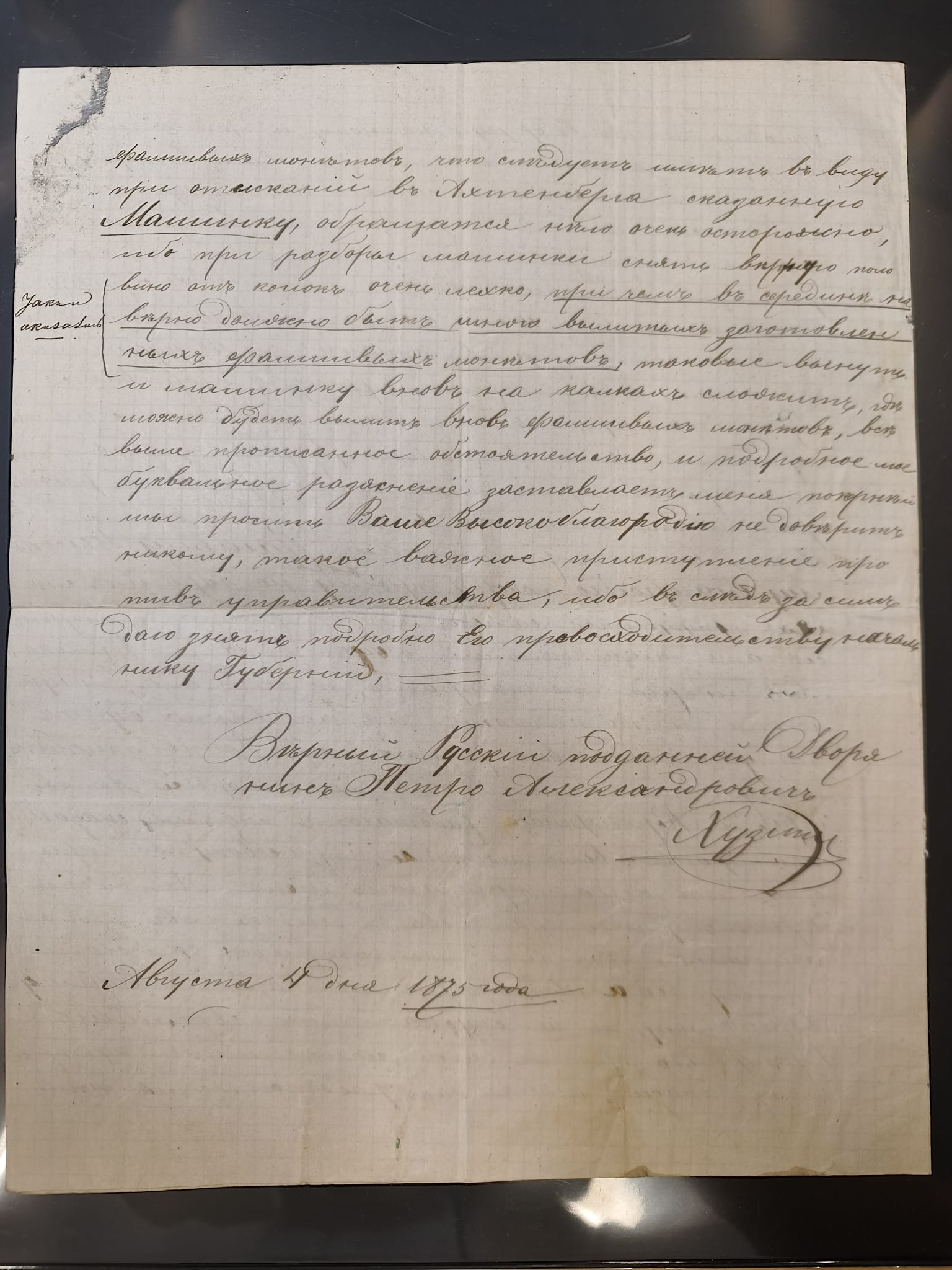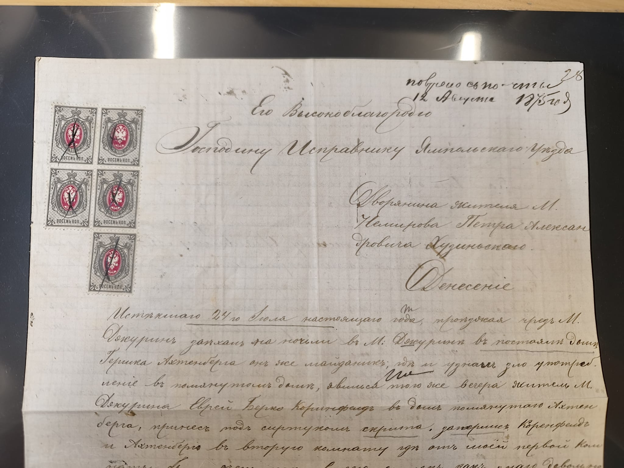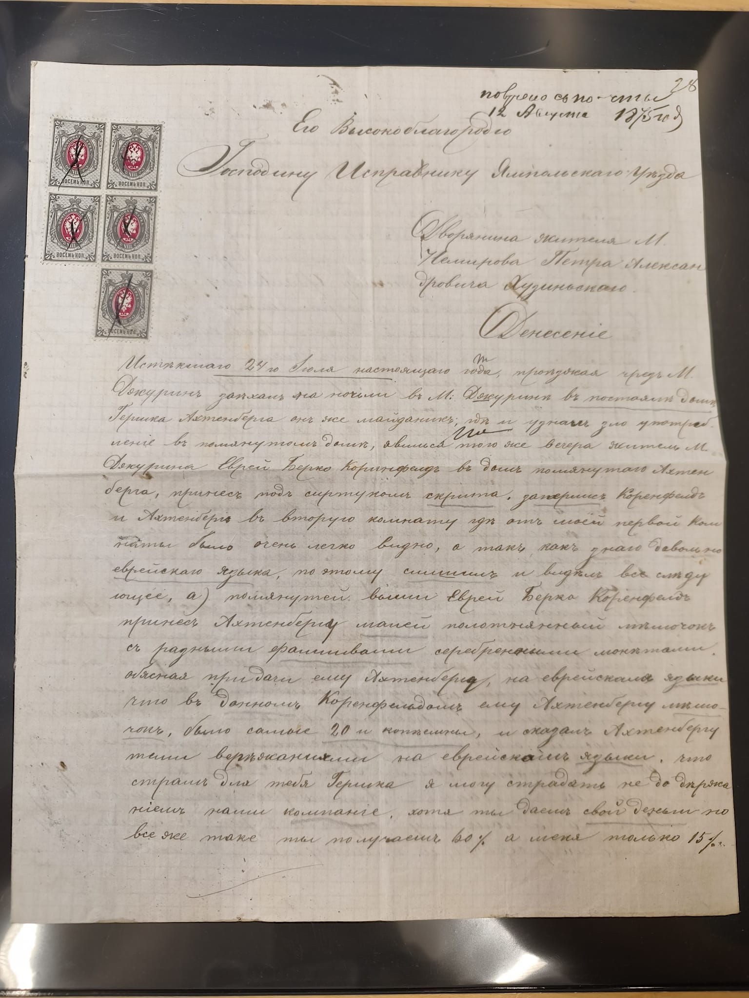 1875/1913, group of 8 covers and cards, some interesting usages including ship mail with “PARAKHODA. OBSCH. R.V.A.P. z 17 7 08” (STEAMSHIP OF EAST ASIATIC STEAMSHIP COMPANY) on 4 k., repeated alongside to postcard to Switzerland, Caspian sea mail with “BAKU-ENZELI PAROKH. 30 1 13” oval cds. on 10 k. on reverse of envelope to Ispahan with transit cds. “TEHERAN (DÉPART) 17. 11 13”, “(TEHERAN) 20.11.13”, very fine, also a similar cover from 1912, etc., together with Mi.-Nr. 26x (bloc of five) used with pen cross to a 1875 police report regarding a crime involving counterfeited coins in the hamlet of Dokurin, mostly fine