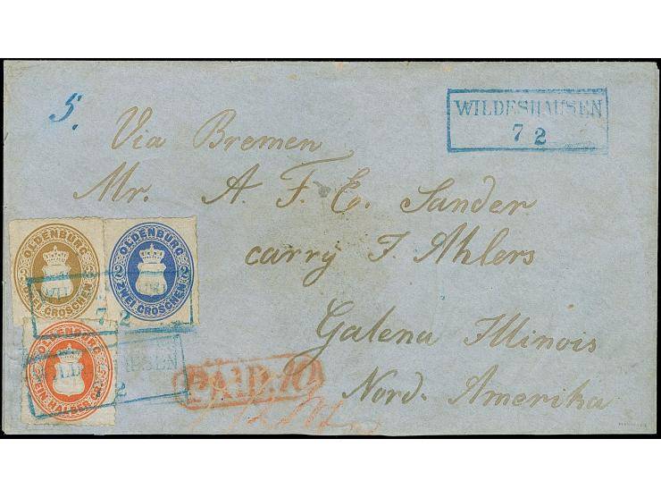 ½ Gr. rötlichorange, 2 Gr. ultramarin und 3 Gr. ockerbraun je mit Durchstich 11¾ und blauem Rahmenstempel “WILDESHAUSEN 7.2." als tarifgerechte Frankatur auf Briefkuvert via Delmenhorst und Bremen mit rotem Ra1 “PAID.10” und Weiterfranko-Vermerk “4½ Wf” nach Galena, Illinois. Der Umschlag mit leichten Reinigungsspuren, Teile der Adresse wurden nachgemalt, und der Umschlag ist zweiseitig geöffnet mit rückseitig ausgeschnittenem Lacksiegel. Die farbfrischen Marken haben allseits einen vollständigen Durchstich und sind in tadelloser Erhaltung. Eine dekorative und seltene Buntfrankatur aus bekannter Korrespondenz mit Destination USA, Fotoattest Stegmüller BPP (2022)
